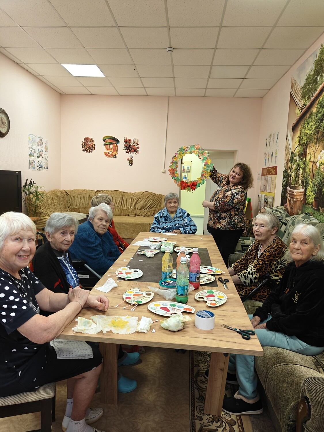 Создали с очаровательными дамами яркий солнечный осенний венок. Подняли настроение и украсили комнату отдыха