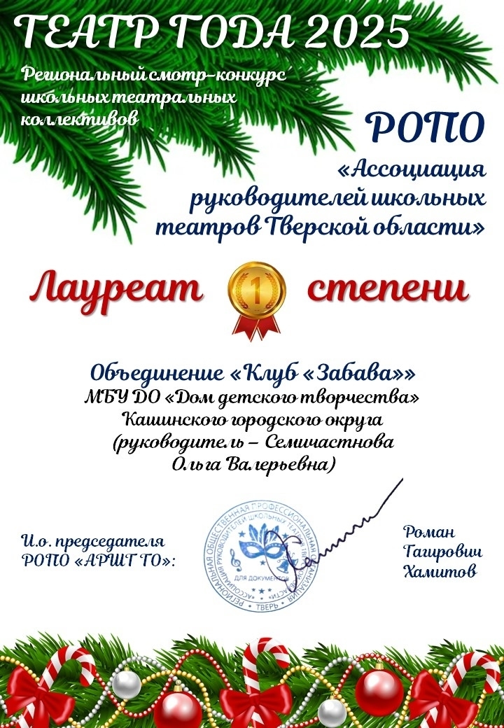 Ассоциацией руководителей школьных театров Тверской области были подведены итоги регионального смотра-конкурса школьных театральных коллективов☀️🎭 и наш "Клуб "Забава" стал лауреатом 1 степени🏆🏆🏆